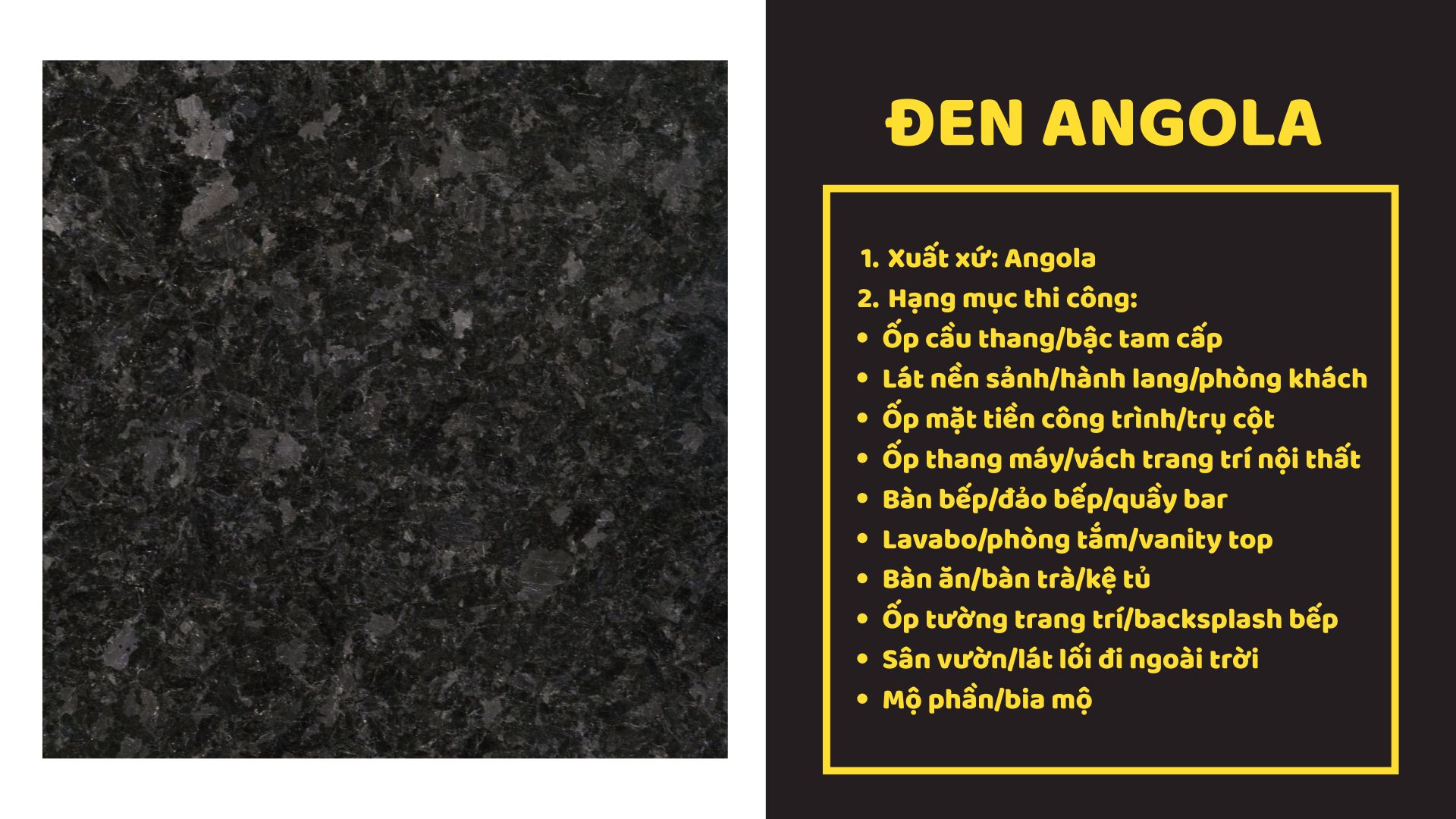 Đá Granite Đen Angola nổi bật với gam màu đen huyền bí, điểm xuyết những hạt khoáng sáng lấp lánh tạo chiều sâu sang trọng. Nhờ độ cứng cao, khả năng chống trầy xước và chịu nhiệt tốt, loại đá này rất được ưa chuộng trong ốp lát mặt bếp, cầu thang và các hạng mục nội ngoại thất cao cấp.