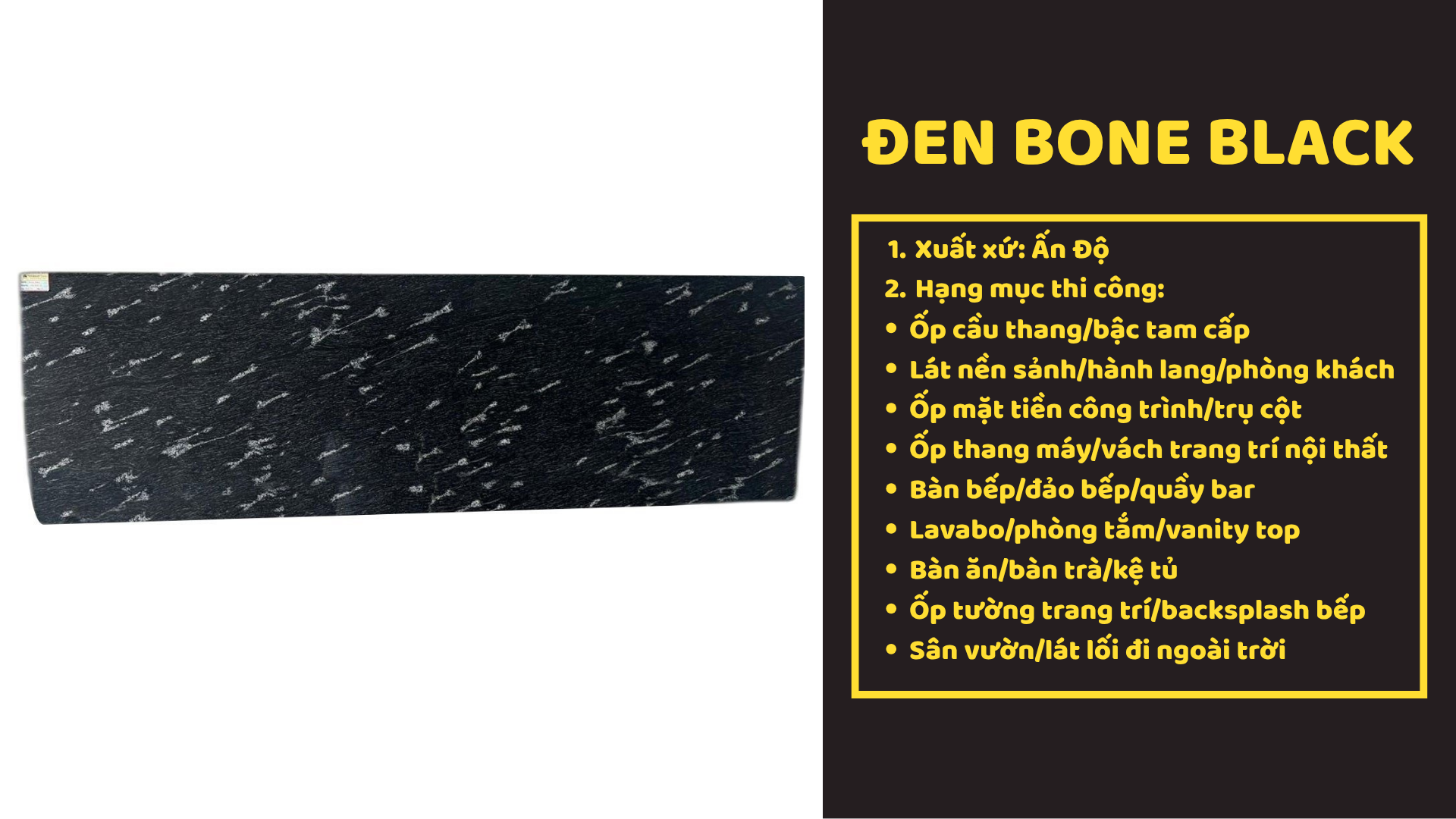 Đá Granite Đen Bone Black nổi bật với gam màu đen chủ đạo, điểm xuyết những đường vân trắng tự nhiên mang lại vẻ đẹp mạnh mẽ và sang trọng. Với độ cứng cao, khả năng chống trầy xước và chịu nhiệt tốt, loại đá này thường được ưa chuộng trong ốp lát nội thất, đặc biệt là mặt bếp và sàn nhà.