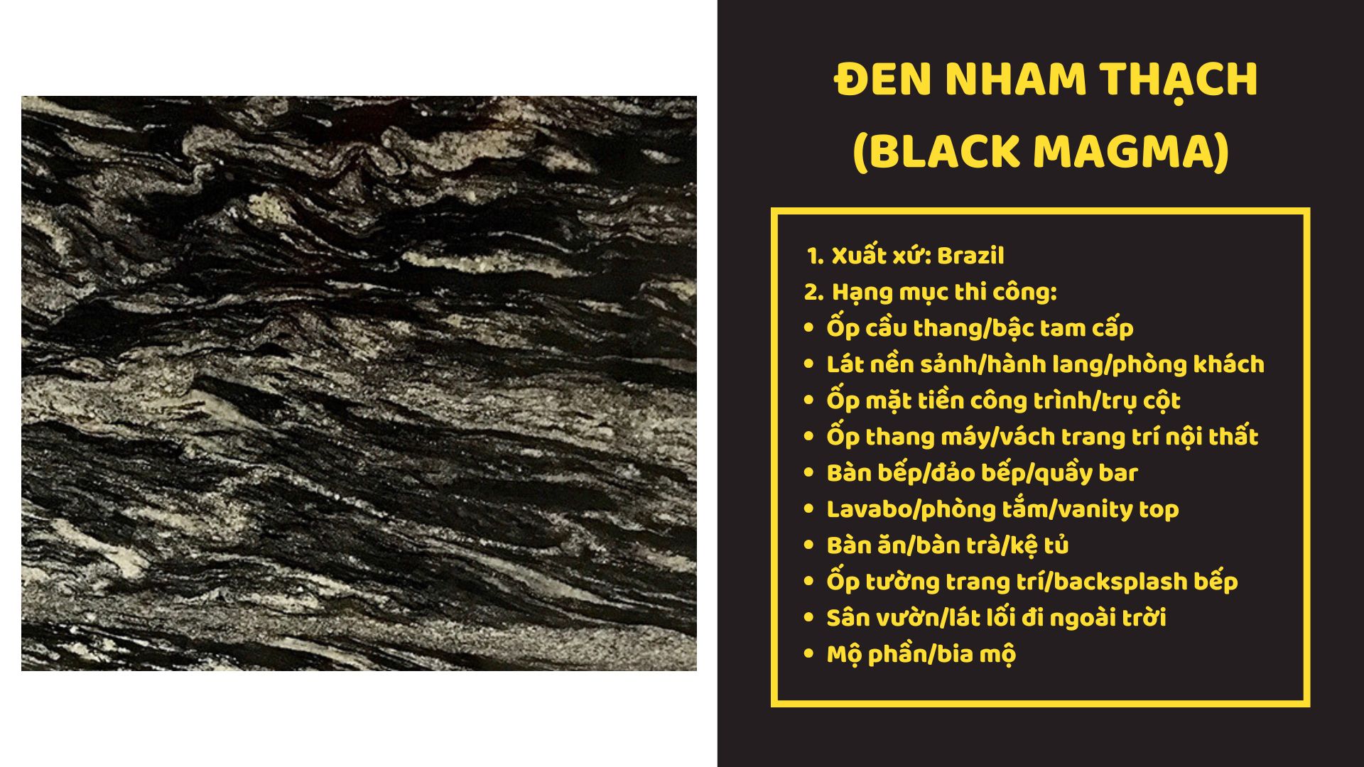 Đá Granite Đen Nham Thạch (Black Magma) mang sắc đen huyền bí điểm xuyết những đường vân trắng và ánh xám độc đáo, gợi liên tưởng đến dòng dung nham phun trào mạnh mẽ. Với độ cứng và độ bền cao, loại đá này thường được sử dụng trong ốp lát nội ngoại thất, mang lại vẻ đẹp sang trọng và đầy cá tính cho không gian.