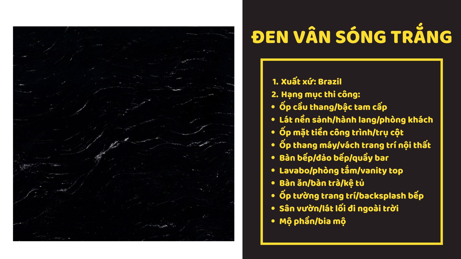 Đá Granite Đen vân sóng trắng nổi bật với nền đen huyền bí được điểm xuyết những đường vân trắng uốn lượn tựa sóng biển, tạo cảm giác sang trọng và đầy cuốn hút. Nhờ độ cứng cao, khả năng chống trầy xước và chịu lực tốt, loại đá này rất được ưa chuộng trong ốp lát sàn, cầu thang hay mặt bàn bếp, mang lại vẻ đẹp hiện đại và bền vững cho không gian.