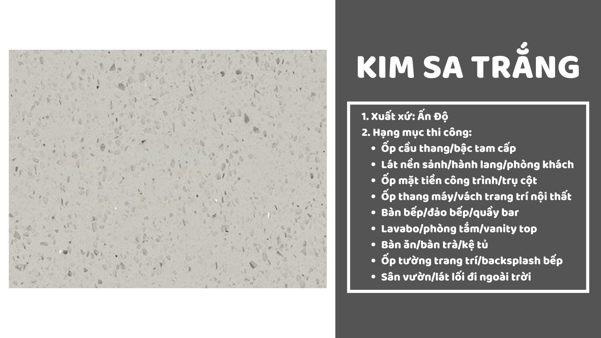 Đá Granite Kim Sa Trắng nổi bật với nền trắng sáng điểm xuyết những hạt tinh thể ánh kim lấp lánh, tạo hiệu ứng sang trọng và hiện đại. Với độ cứng cao, bền màu và khả năng chống trầy xước tốt, loại đá này thường được sử dụng trong ốp lát nội ngoại thất, mang lại vẻ đẹp tinh tế và bền vững cho không gian.