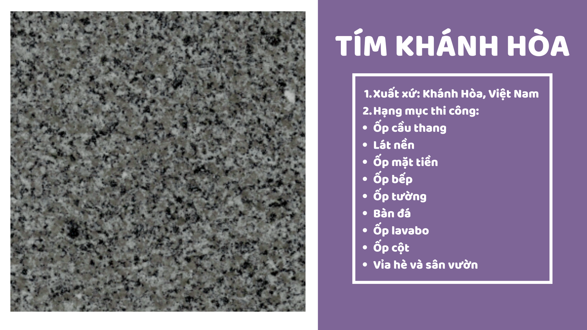 Đá Granite Tím Khánh Hoà sở hữu gam màu tím đặc trưng kết hợp cùng những hạt khoáng óng ánh, tạo nên vẻ đẹp sang trọng và độc đáo. Với độ cứng cao, khả năng chịu lực và chống trầy xước tốt, loại đá này thường được ứng dụng trong lát nền, cầu thang và ốp mặt tiền, mang lại không gian bền vững và ấn tượng.