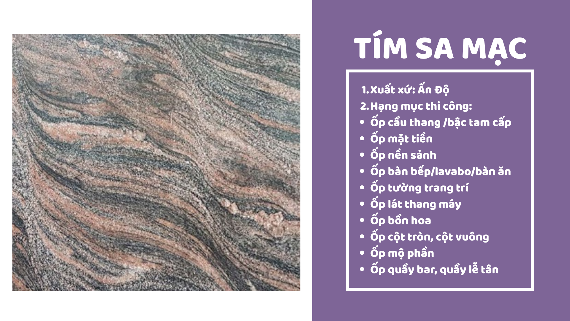 Đá Granite Tím Sa Mạc sở hữu gam màu tím huyền bí xen lẫn những đường vân trắng và xám độc đáo, mang đến vẻ đẹp sang trọng và cuốn hút. Với độ cứng cao, khả năng chịu lực và chống trầy xước tốt, loại đá này thường được lựa chọn cho ốp lát, mặt bàn bếp hay cầu thang, tạo điểm nhấn khác biệt cho không gian.