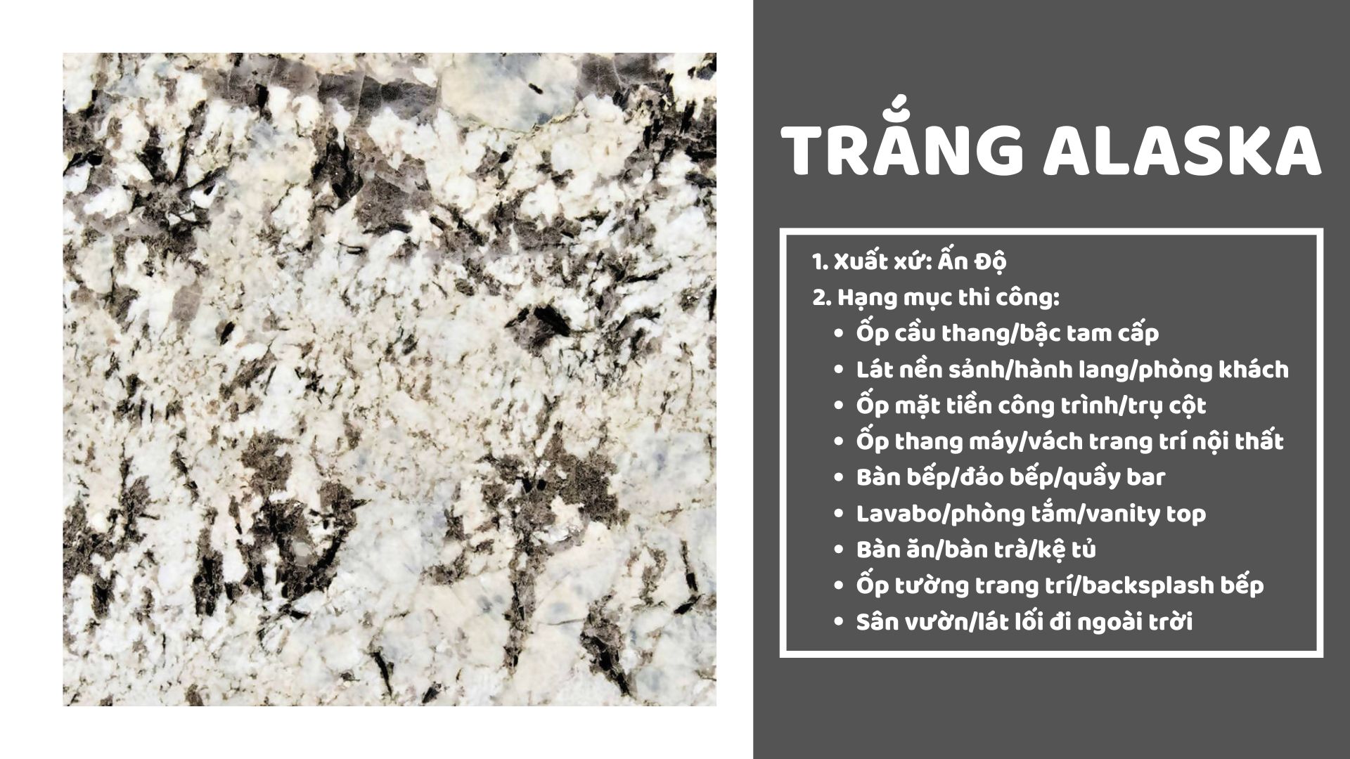 Đá hoa cương Trắng Alaska (Alaska White Granite) là một loại đá granite tự nhiên cao cấp, được khai thác chủ yếu từ các mỏ đá ở Brazil và một số khu vực ở Ấn Độ, đặc biệt là bang Rajasthan. Đá được hình thành từ quá trình biến chất của đá vôi, đá carbonate hoặc dolomit, tạo nên cấu trúc tinh thể thạch anh xen kẽ, mang lại vẻ đẹp độc đáo và độ bền vượt trội. Đây là lựa chọn lý tưởng cho các công trình sang trọng nhờ sự kết hợp giữa tính thẩm mỹ và đặc tính vật lý ưu việt.