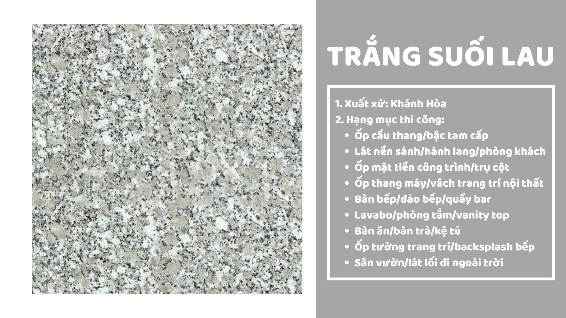 Đá granite trắng Suối Lau là một loại đá hoa cương tự nhiên được khai thác chủ yếu tại các mỏ đá ở Việt Nam, đặc biệt nổi bật ở Khánh Hòa và Bình Định. Đá có màu nền trắng xám nhẹ hoặc trắng sáng, điểm xuyết các hạt khoáng nhỏ màu đen, xám, xanh da trời nhạt, đôi khi xen kẽ tím hoặc hồng phấn, tạo nên hoa văn tinh tế, hài hòa.