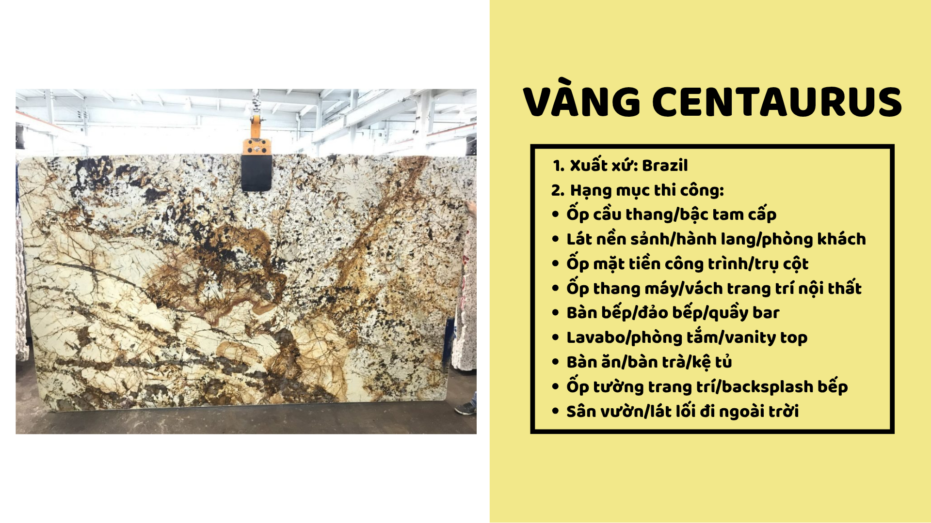 Đá Granite Vàng Centaurus nổi bật với gam màu vàng ấm áp kết hợp cùng những đường vân đen và nâu tự nhiên, tạo nên vẻ đẹp sang trọng và độc đáo. Với độ cứng cao, khả năng chống trầy xước và chịu lực tốt, loại đá này thường được sử dụng cho mặt bàn bếp, cầu thang và ốp lát nội ngoại thất, mang đến không gian đẳng cấp và bền vững.