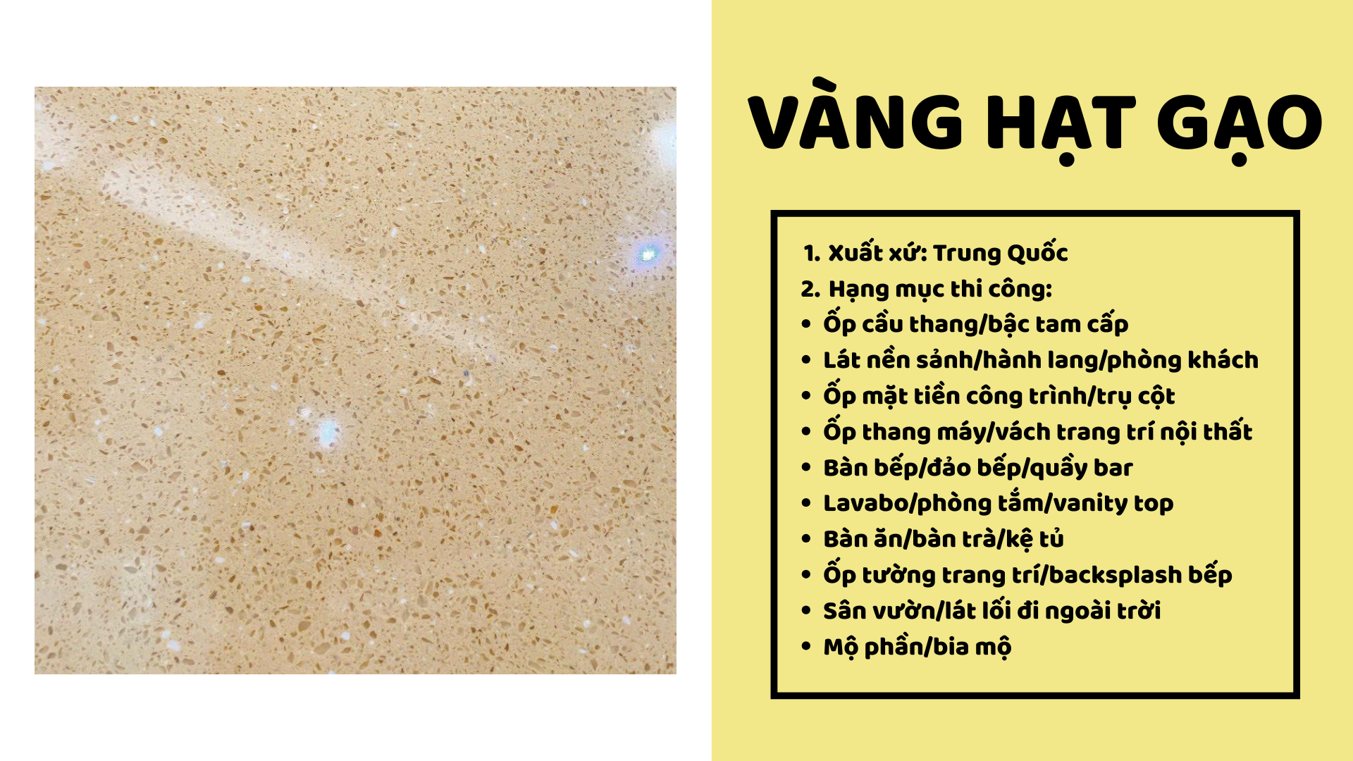 Đá Granite Vàng hạt gạo nổi bật với gam màu vàng ấm kết hợp cùng các hạt khoáng li ti như hạt gạo, tạo nên vẻ đẹp tự nhiên và hài hòa. Với độ cứng cao, khả năng chống trầy xước và chịu nhiệt tốt, loại đá này thường được ưa chuộng trong ốp bếp, mặt bàn và lát sàn, mang lại không gian sang trọng và bền bỉ.