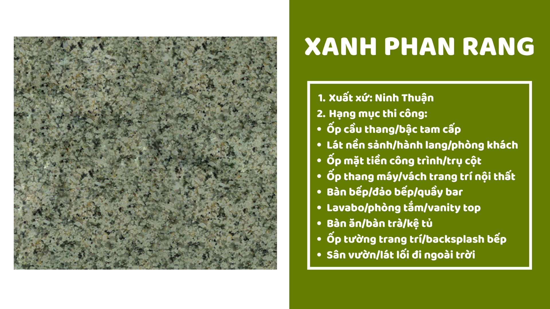 Đá Granite Xanh Phan Rang nổi bật với gam màu xanh đặc trưng, kết hợp cùng những hạt khoáng tự nhiên óng ánh tạo chiều sâu và sự sang trọng. Với độ cứng và khả năng chống trầy xước cao, loại đá này rất phù hợp cho các hạng mục ốp lát nội ngoại thất, mang lại vẻ đẹp bền vững và độc đáo cho công trình.