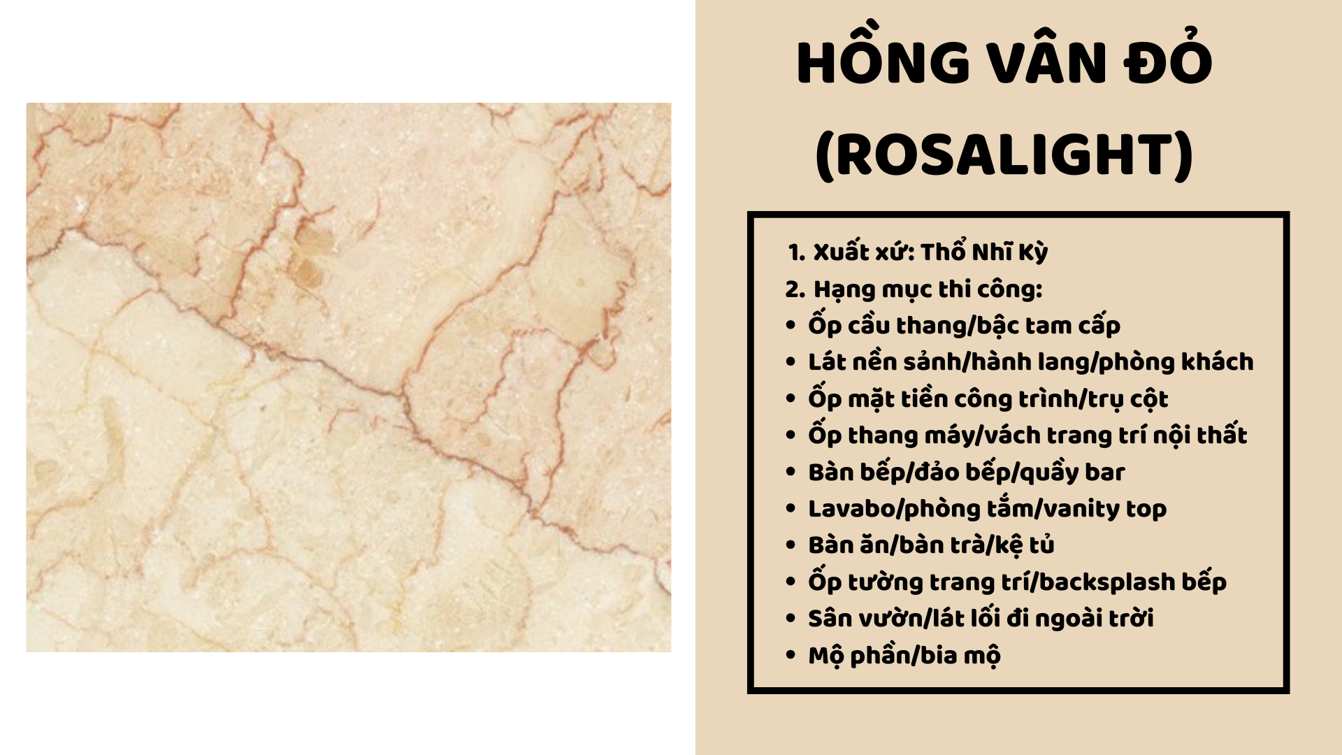 Đá Marble Hồng vân đỏ (Rosalight), một loại đá cẩm thạch tự nhiên, nổi bật với tông màu hồng nhạt tạo nên một vẻ đẹp tinh tế và lãng mạn. Với độ cứng và độ bền cao, đá Rosalight thường được ứng dụng rộng rãi trong thiết kế nội thất, từ ốp tường, sàn nhà, mặt bàn bếp, đến trang trí các không gian sang trọng như phòng tắm và sảnh khách sạn, mang lại cảm giác ấm cúng, thanh lịch và đẳng cấp.