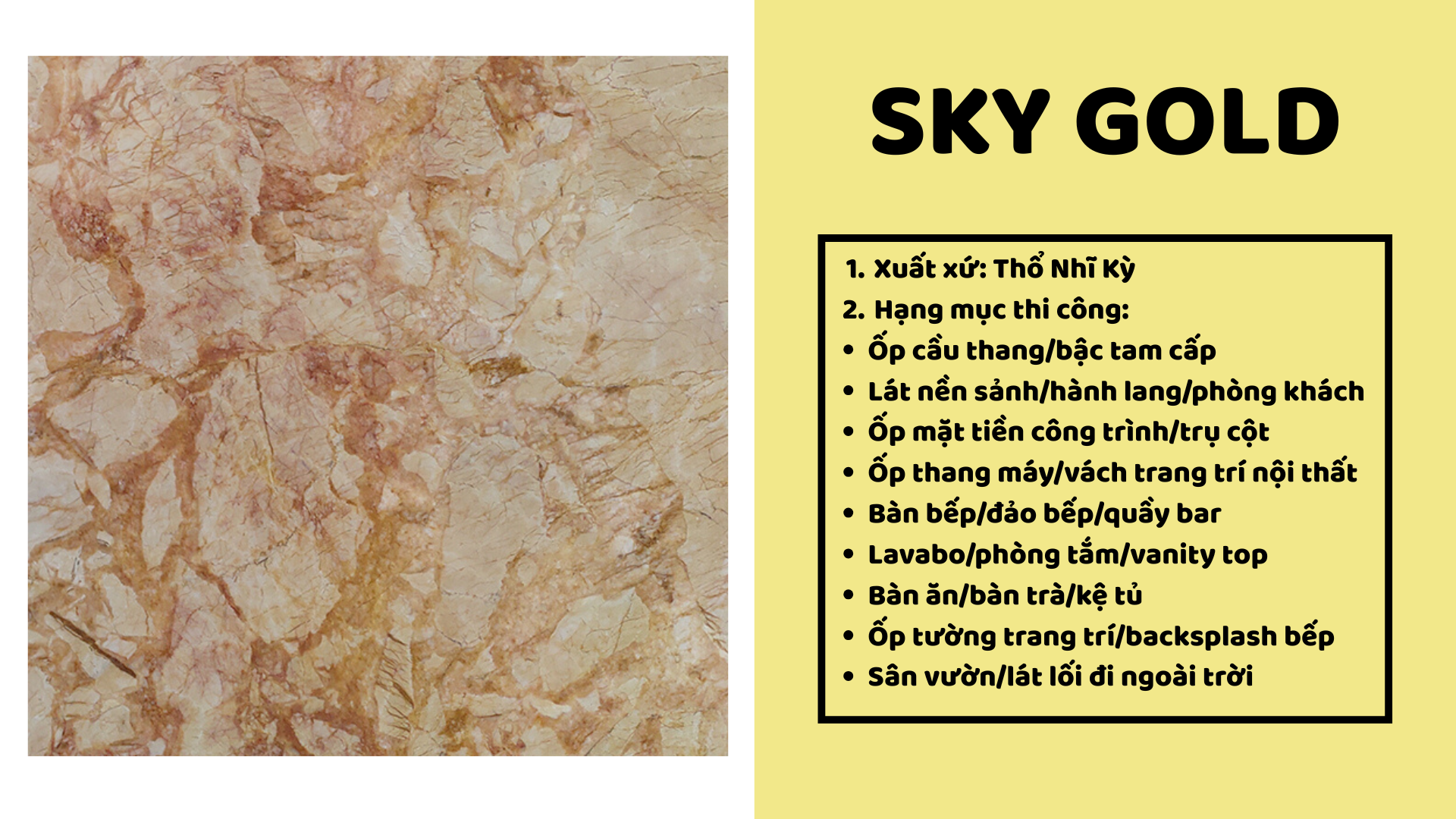 Đá Marble Sky Gold nổi bật với gam màu vàng óng ấm áp, điểm xuyết những đường vân tự nhiên mềm mại, tạo cảm giác sang trọng và tinh tế. Với vẻ đẹp tự nhiên độc đáo, loại đá này thường được sử dụng trong ốp lát nội thất cao cấp, mang lại không gian ấm cúng và đẳng cấp.
