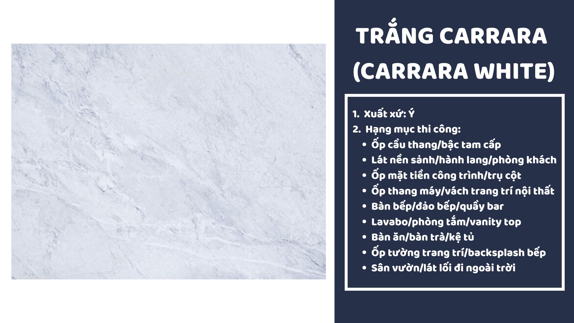 Đá Marble Carrara White nổi bật với nền trắng tinh tế, điểm xuyết những đường vân xám mềm mại đầy tự nhiên. Vẻ đẹp thanh lịch và sang trọng của loại đá này khiến nó trở thành lựa chọn lý tưởng cho các công trình cao cấp, từ ốp lát nội thất đến trang trí không gian hiện đại.