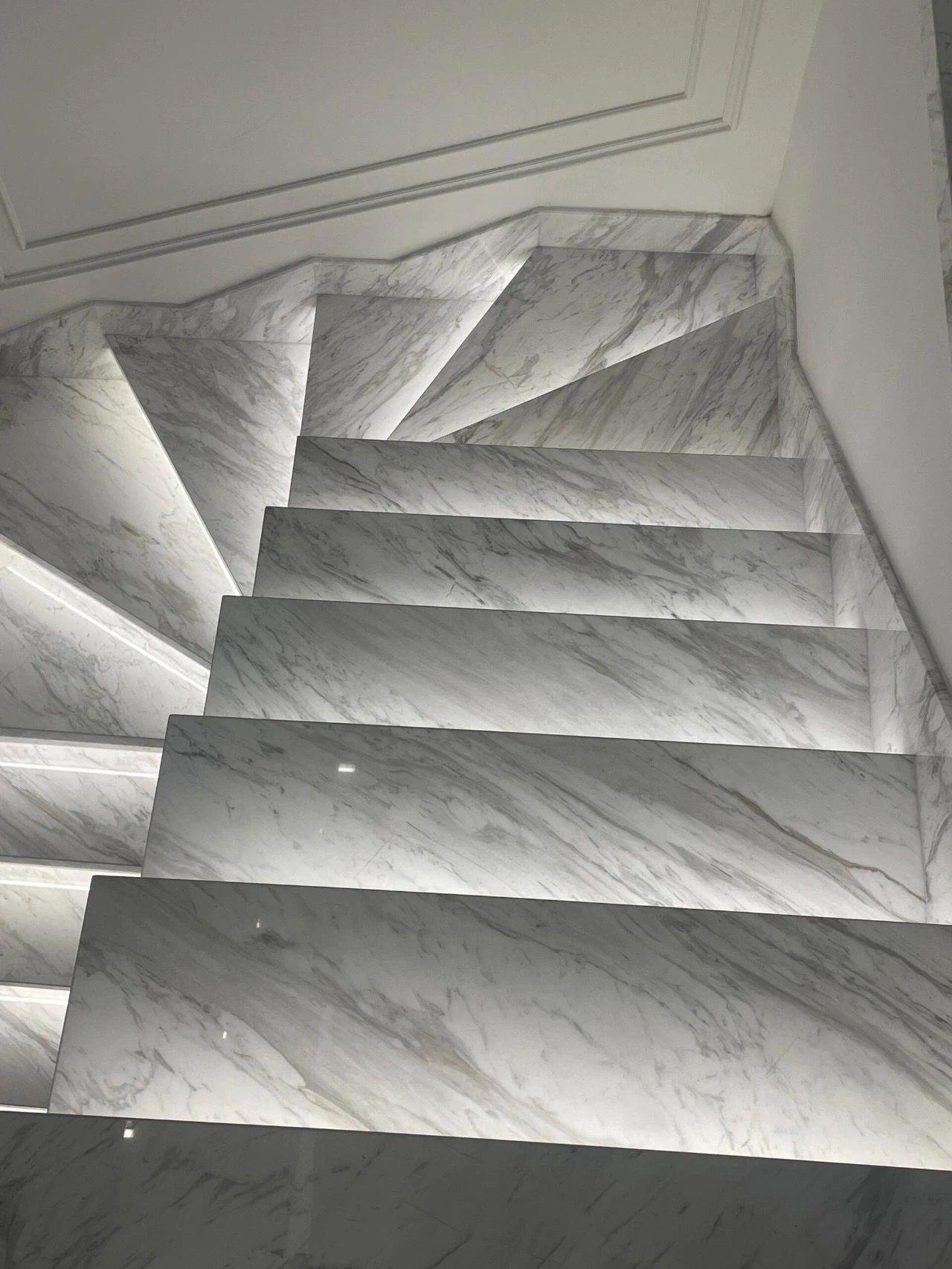 Cầu thang ốp đá Marble Trắng vân mây (Volakas White)