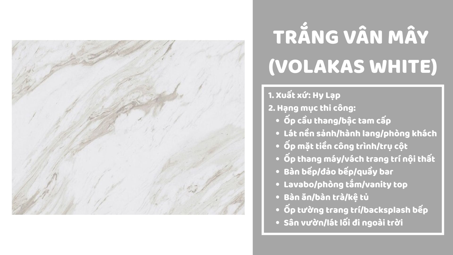 Đá Marble Trắng vân mây Volakas là loại đá tự nhiên có nền màu trắng chủ đạo, nổi bật với các vân mây màu xám, đen hoặc xanh nhạt uốn lượn mềm mại, tạo cảm giác nhẹ nhàng, thanh thoát. Đá có độ cứng cao, bền, chống thấm tốt, phù hợp cho ốp lát nội thất như mặt bàn bếp, cầu thang, sàn nhà, mang lại vẻ đẹp sang trọng, hiện đại. Thường được khai thác từ các mỏ đá ở Việt Nam hoặc nhập khẩu.