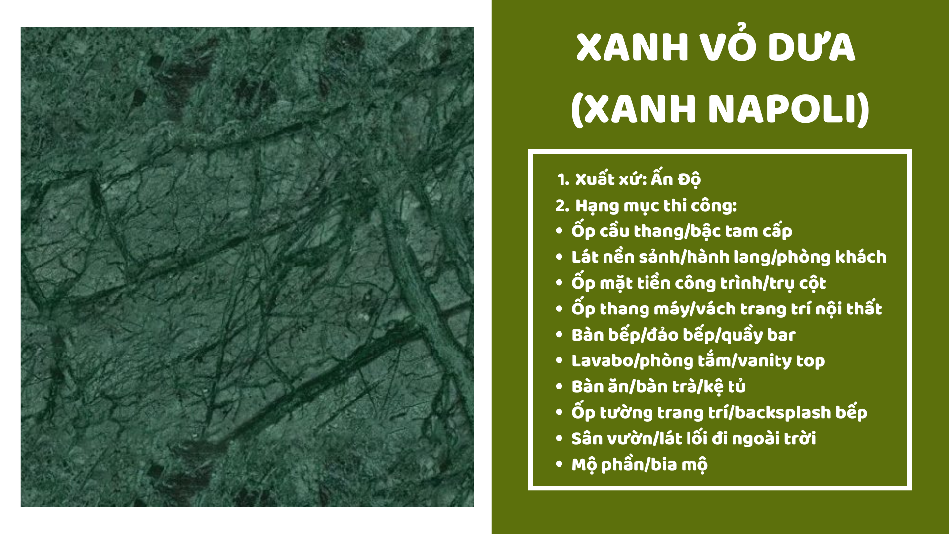 Đá Marble Xanh Napoli là loại đá cẩm thạch tự nhiên nổi bật với màu xanh lá cây đặc trưng, xen kẽ các đường vân trắng hoặc xám uốn lượn, mang lại vẻ đẹp sang trọng, tinh tế. Đá có độ cứng và độ bền tốt, thường được dùng cho ốp lát nội thất như cầu thang, bàn bếp, vách trang trí. Xuất xứ từ các mỏ đá ở Udaipur và Dungarpur, bang Rajasthan, Ấn Độ.