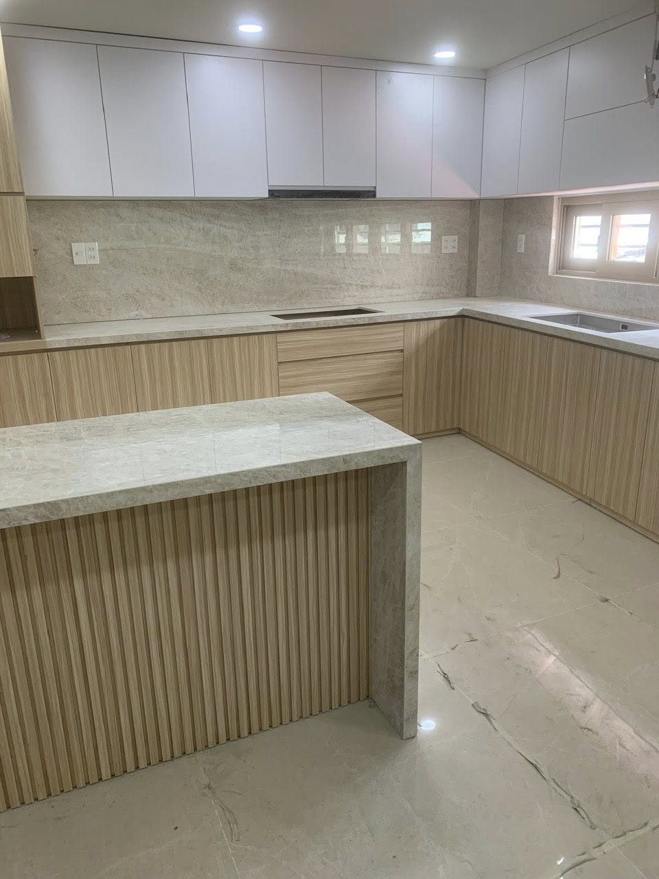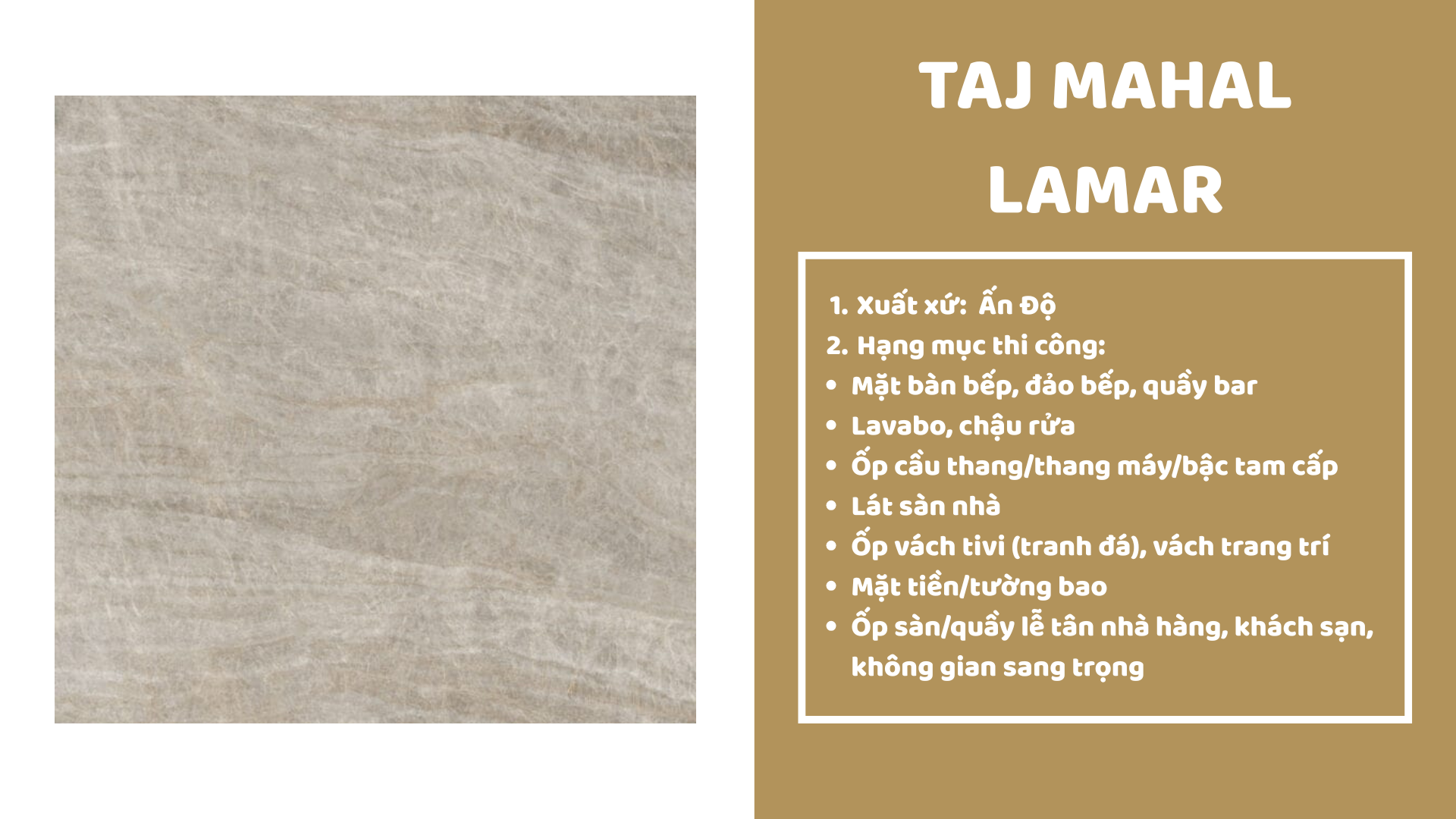 Đá Nung Kết Taj Mahal nổi bật với gam màu xám kem sáng ấm áp, xen kẽ những đường vân mảnh tinh tế mang lại cảm giác mềm mại và sang trọng. Bề mặt đá sáng bóng, thanh lịch, rất phù hợp để ứng dụng trong các không gian nội thất cao cấp. Đây là lựa chọn lý tưởng cho mặt bàn bếp, quầy bar, hay các hạng mục ốp lát cần sự tinh tế và đẳng cấp.
