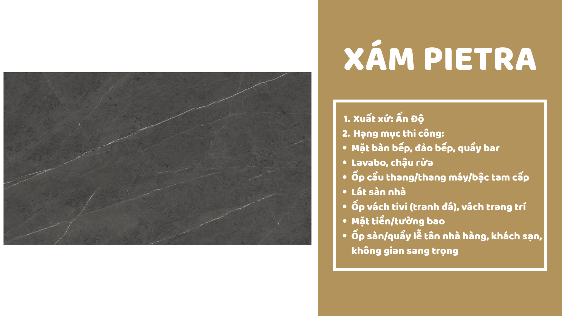 Đá Nung kết Xám Pietra mang sắc xám trung tính hiện đại, kết hợp cùng những đường vân mềm mại tạo cảm giác tự nhiên và sang trọng. Với độ bền cao, bề mặt chắc chắn, loại đá này phù hợp cho cả không gian nội thất lẫn ngoại thất, mang đến vẻ đẹp thanh lịch và tinh tế.