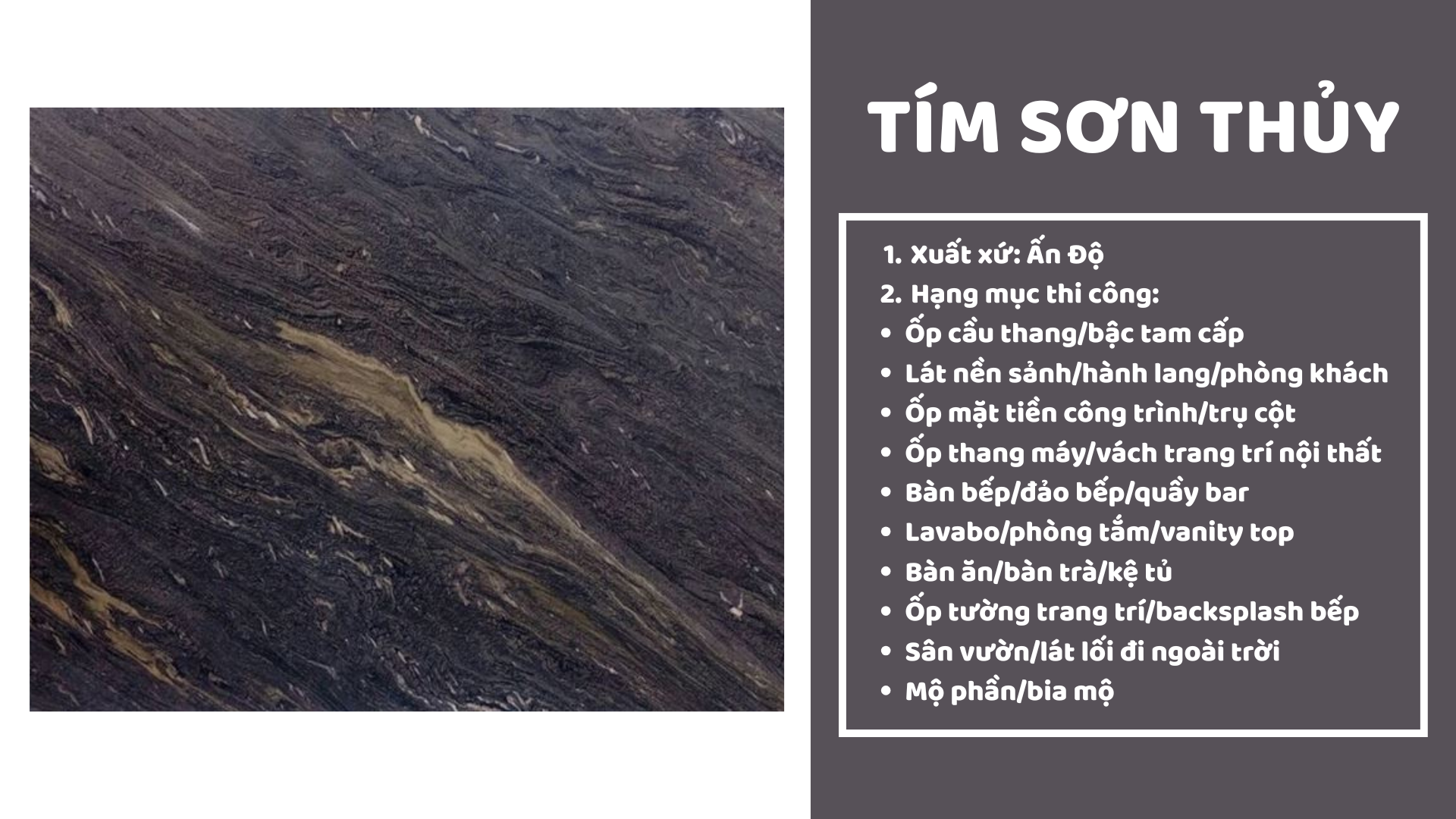 Đá Marble Tím Sơn Thủy là dòng đá tự nhiên cao cấp nổi bật với gam màu tím hòa quyện cùng những đường vân trắng, xám, xanh đan xen như bức tranh thủy mặc sống động. Vẻ đẹp độc đáo, sang trọng và đầy tính nghệ thuật của loại đá này giúp không gian nội thất trở nên tinh tế, cuốn hút và khác biệt.