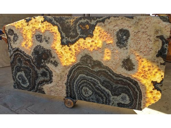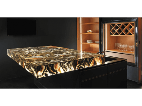 Đá xuyên sáng trong hình mang sắc nâu – vàng chủ đạo với những mảng màu loang tự nhiên như những đám mây và tầng địa chất cổ xưa. Các đường vân tối – sáng đan xen tạo nên chiều sâu, khi có ánh sáng xuyên qua càng trở nên huyền ảo và rực rỡ. Đây là loại đá thường được sử dụng để làm điểm nhấn trong nội thất cao cấp, mang lại vẻ đẹp độc đáo, sang trọng và đầy tính nghệ thuật.