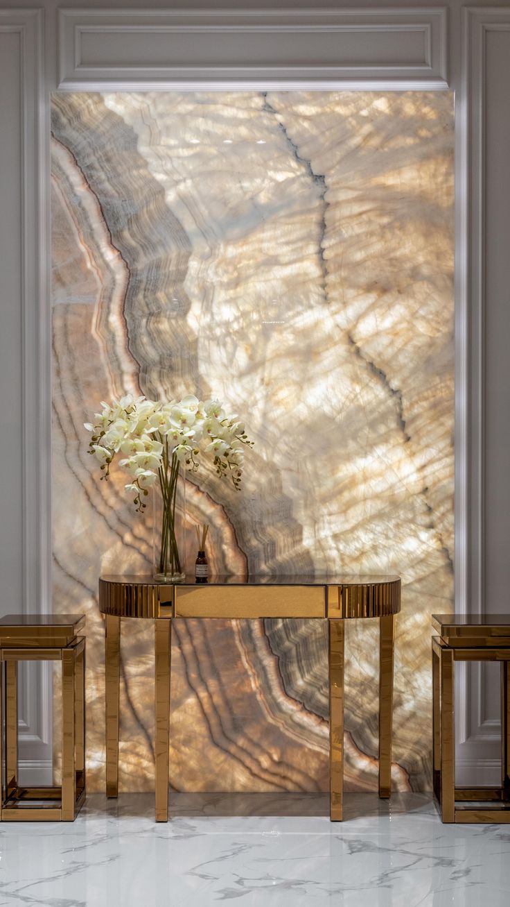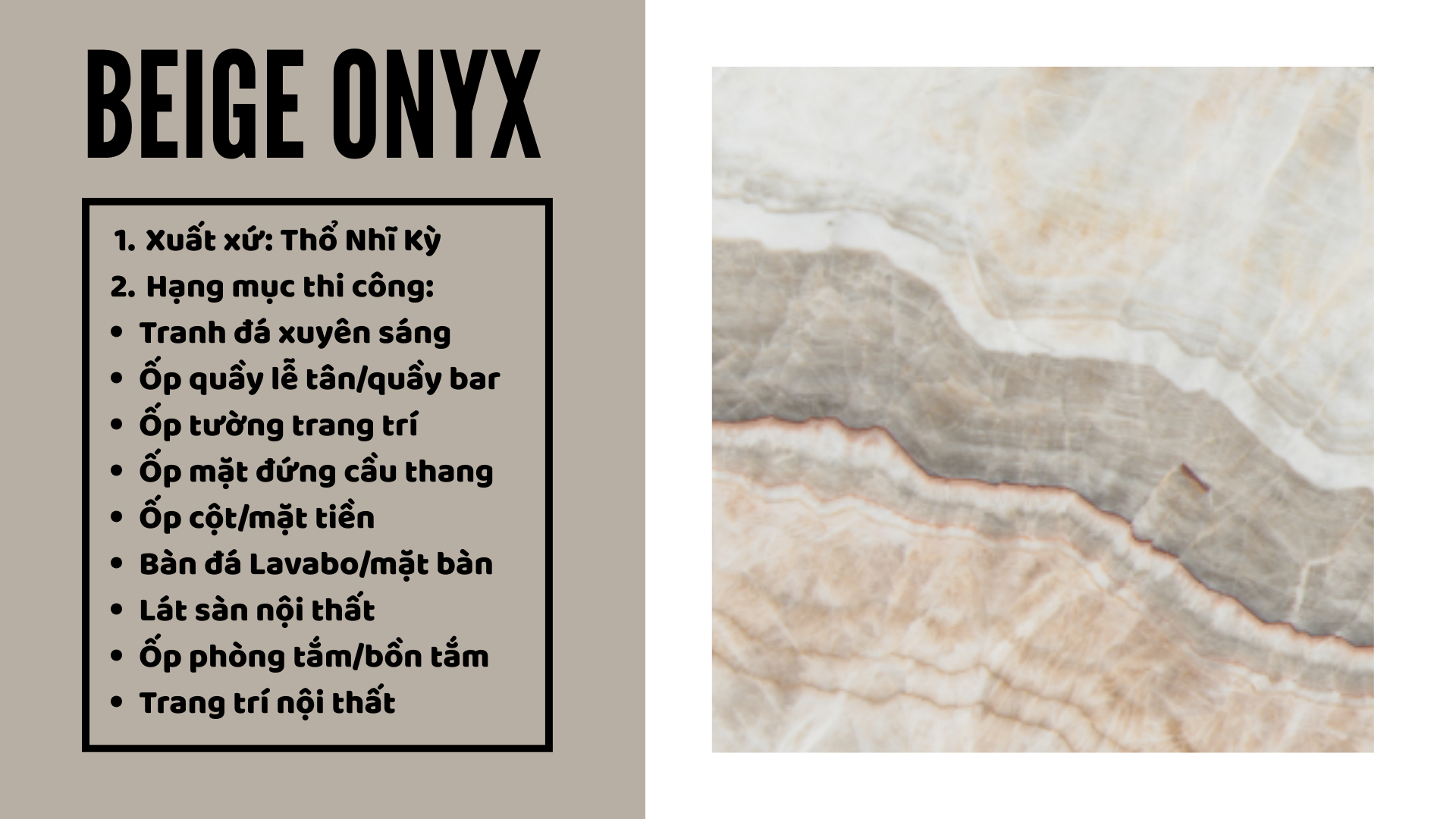 Đá xuyên sáng Beige Onyx có màu be nhẹ nhàng, sang trọng, kết hợp với những vân mây tự nhiên uyển chuyển, tạo cảm giác ấm áp và tinh tế. Nhờ khả năng xuyên sáng đặc trưng của onyx, khi được chiếu sáng, đá phát ra ánh sáng dịu dàng, tôn lên vẻ đẹp huyền ảo, thường được dùng trong trang trí nội thất cao cấp như quầy bar, vách ốp, bàn tiếp khách hay các điểm nhấn nghệ thuật.