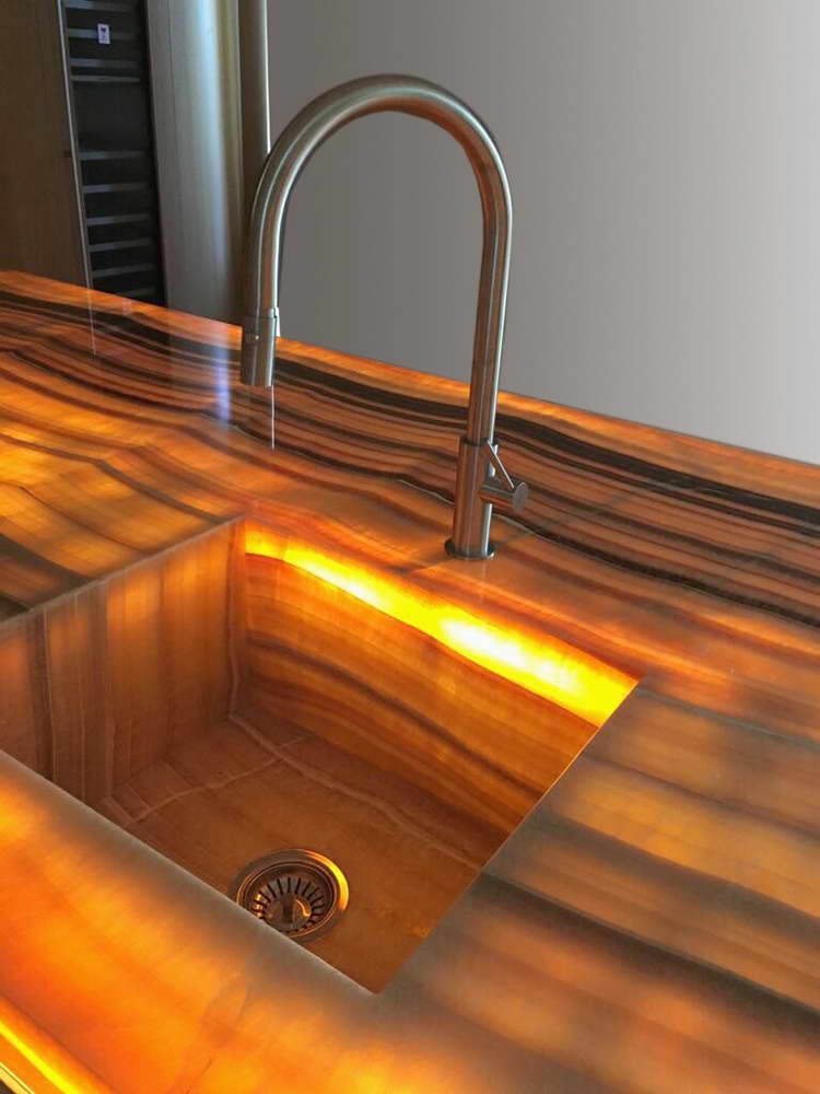 Lavabo ốp đá xuyên sáng Tiger Onyx khi bật đèn