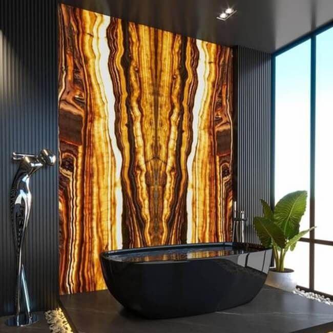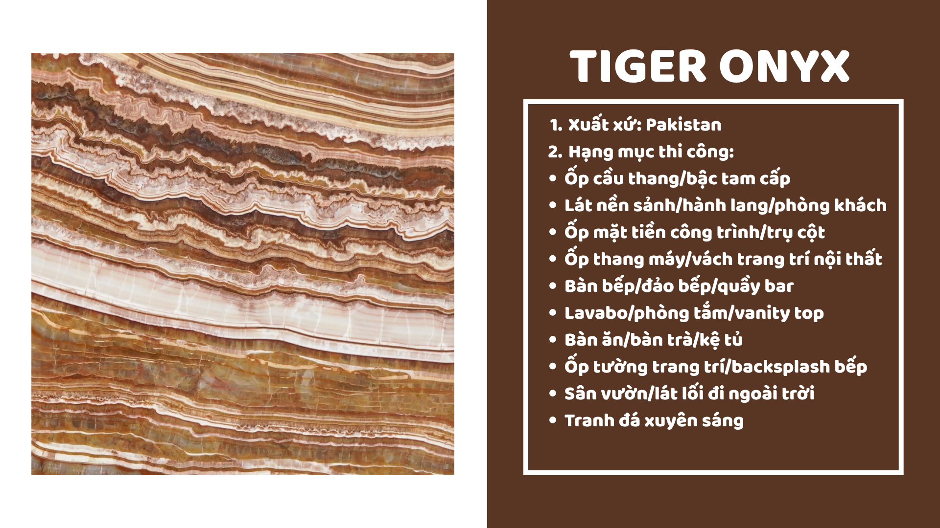 Đá xuyên sáng Tiger Onyx là dòng onyx tự nhiên cao cấp, nổi bật với các vân màu vàng, nâu, đen xen kẽ như vằn hổ độc đáo. Khi kết hợp với hệ thống đèn nền, đá phát sáng rực rỡ, tạo hiệu ứng sang trọng và huyền ảo. Nhờ vẻ đẹp ấn tượng, Tiger Onyx thường được sử dụng cho quầy bar, quầy lễ tân, vách trang trí, bàn trà và các công trình nghệ thuật nội thất cao cấp.