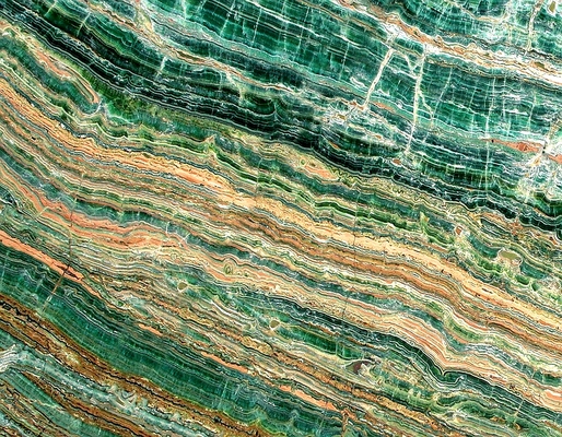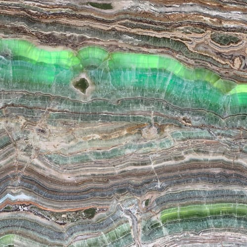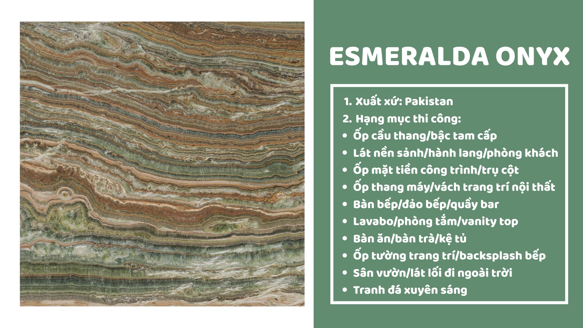 Đá xuyên sáng Xanh Esmeralda mang sắc xanh ngọc chủ đạo, xen kẽ các lớp vân vàng, nâu và cam chạy uốn lượn như những dải sóng tự nhiên. Hiệu ứng tầng lớp sống động tạo chiều sâu và sự cuốn hút đặc biệt. Khi có ánh sáng chiếu qua, đá trở nên rực rỡ và huyền ảo, rất thích hợp để sử dụng trong các hạng mục trang trí cao cấp như vách ốp, quầy bar, bàn nghệ thuật hay không gian nội thất sang trọng.