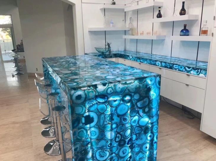 Đảo bếp ốp đá xuyên sáng xanh vân chỉ
