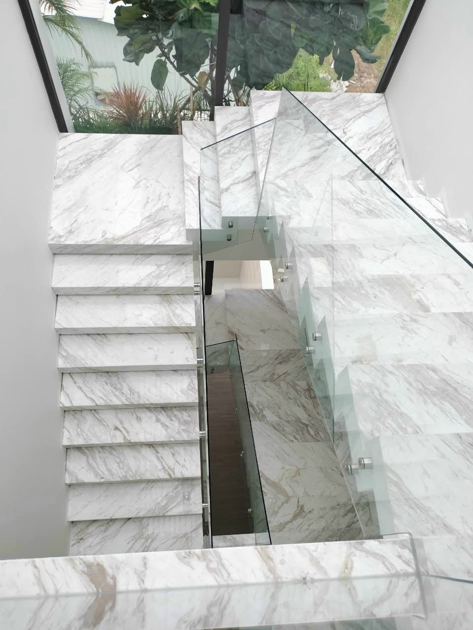 • Ưu điểm: Đá Marble khi ốp cầu thang mang lại vẻ đẹp sang trọng và tinh tế nhờ những đường vân tự nhiên độc đáo, giúp không gian trở nên đẳng cấp và ấn tượng. Bề mặt đá sáng bóng, mát lạnh, tạo cảm giác thoải mái khi sử dụng, đồng thời dễ dàng vệ sinh và giữ được độ bền màu theo thời gian. Đây là lựa chọn lý tưởng để nâng tầm thẩm mỹ và giá trị cho công trình.