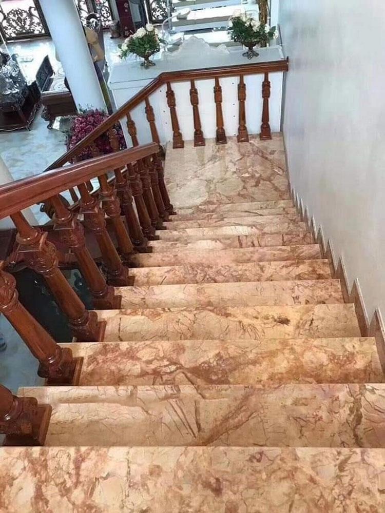 - Ưu điểm: Đá Marble khi ốp cầu thang mang lại vẻ đẹp sang trọng và tinh tế nhờ những đường vân tự nhiên độc đáo, giúp không gian trở nên đẳng cấp và ấn tượng. Bề mặt đá sáng bóng, mát lạnh, tạo cảm giác thoải mái khi sử dụng, đồng thời dễ dàng vệ sinh và giữ được độ bền màu theo thời gian. Đây là lựa chọn lý tưởng để nâng tầm thẩm mỹ và giá trị cho công trình.