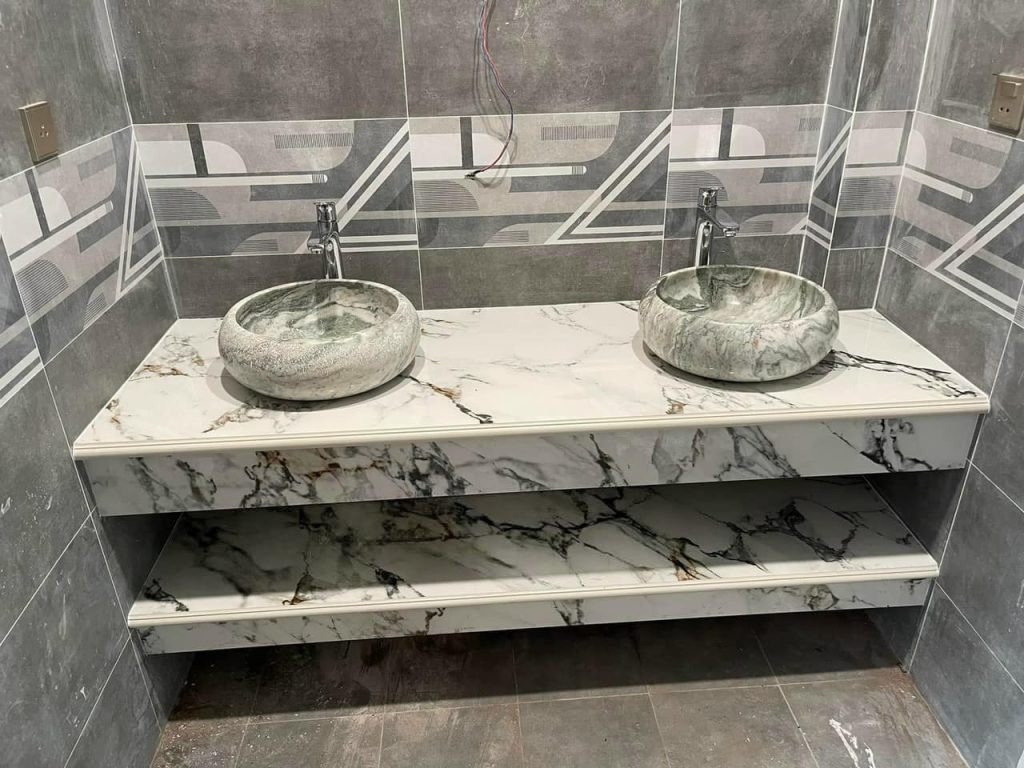 trong không gian phòng tắm. Với màu sắc và vân đá tinh tế, đá Nung kết Lavabo
