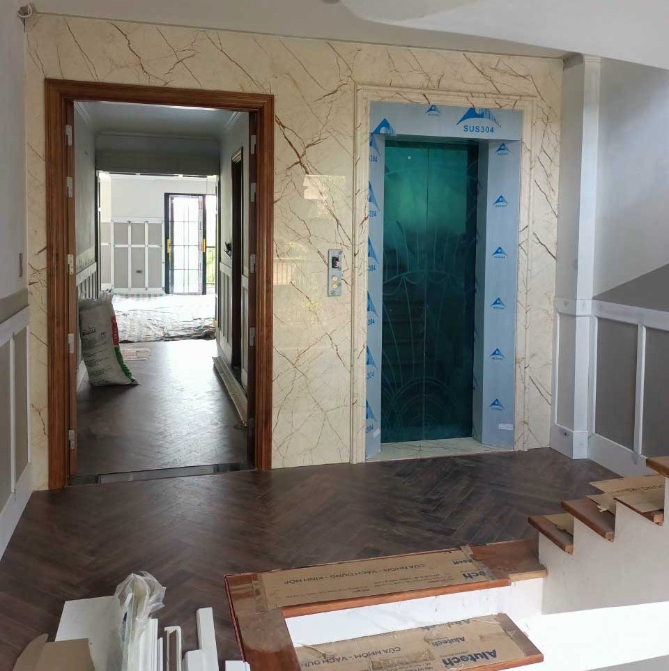 • Ưu điểm: Đá Marble khi ốp thang máy mang lại vẻ đẹp sang trọng và đẳng cấp nhờ bề mặt bóng mịn cùng hoa văn tự nhiên độc đáo. Loại đá này giúp không gian thang máy trở nên tinh tế, tạo điểm nhấn thẩm mỹ cao, đồng thời có độ bền tốt, dễ lau chùi và giữ được vẻ sáng mới trong thời gian dài.